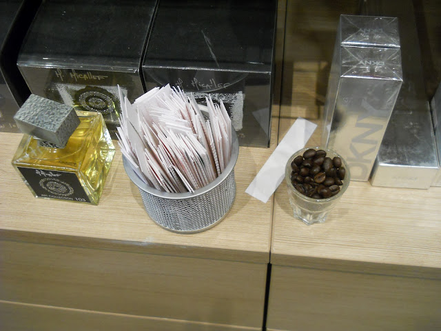 In una profumeria, i chicchi di caffé che neutralizzano la memoria olfattiva per poter provare i profumi. |